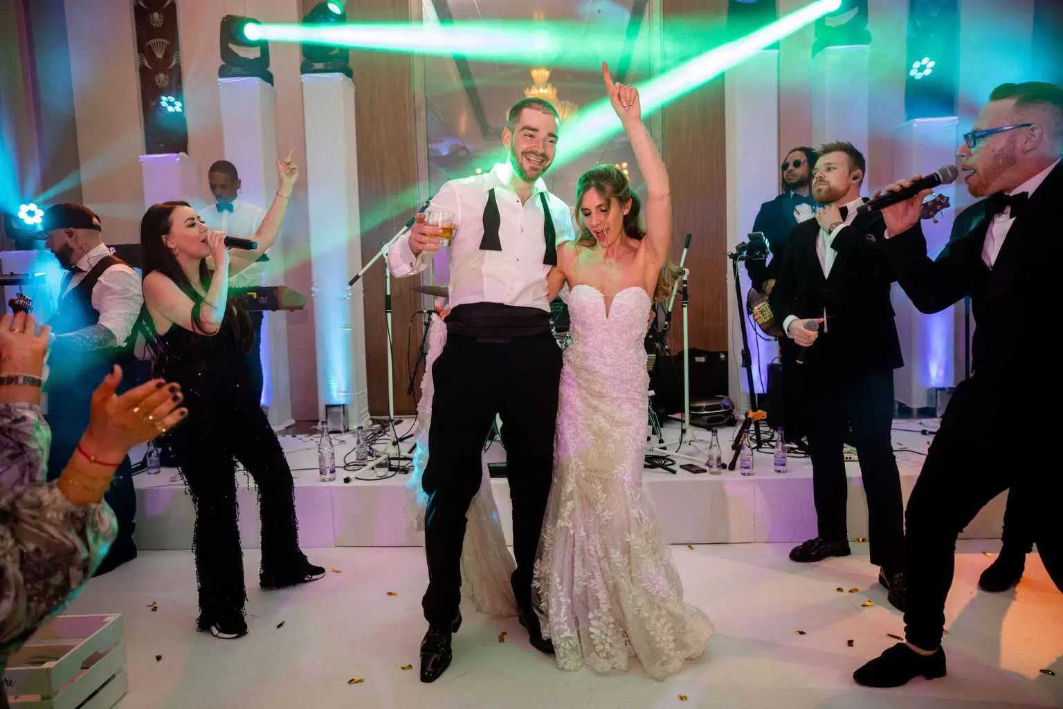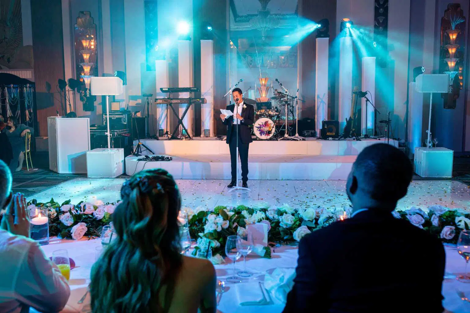 “Just want to say a huge thank you to you all for making Tash and Joel’s wedding an absolutely fantastic event. More than anything I was bowled over by the lighting stands behind the band, that was a brilliant compromise between fabric backdrop and nothing, in Keeping with the Art Deco room.