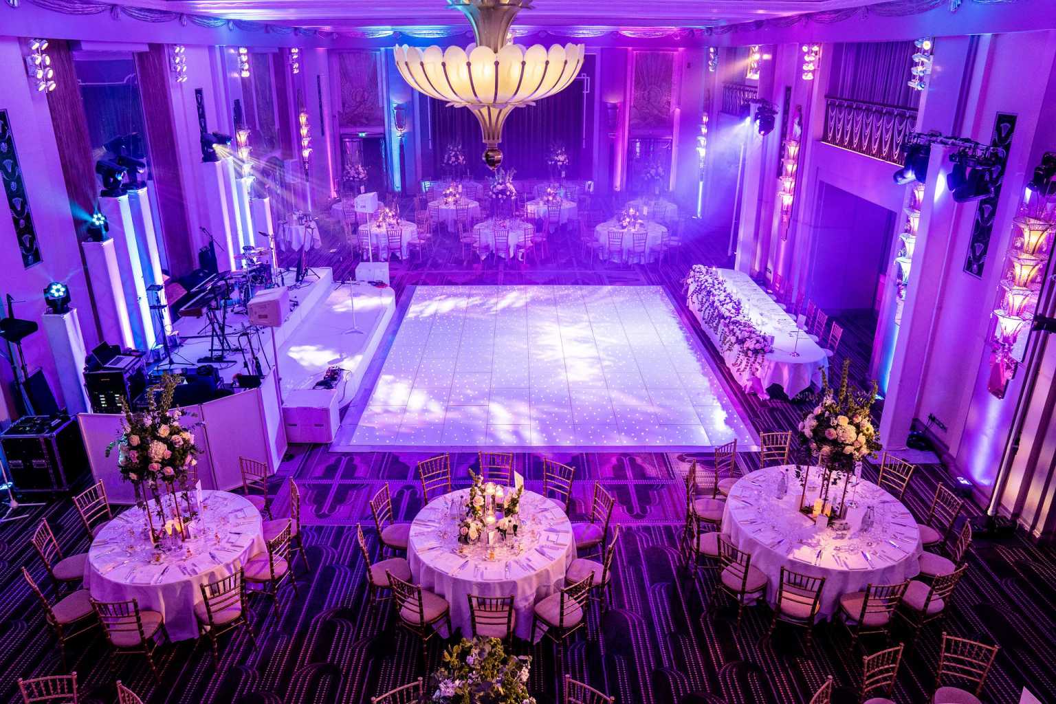 Our team delivered staging for both the band and the Chuppah as well as an aisle runner and ceremony lighting. We then provided extra lighting for the ballroom and dance floor, ensuring that the room not only looked sensational, but also reflected the mood of the evening throughout the music and the speeches.